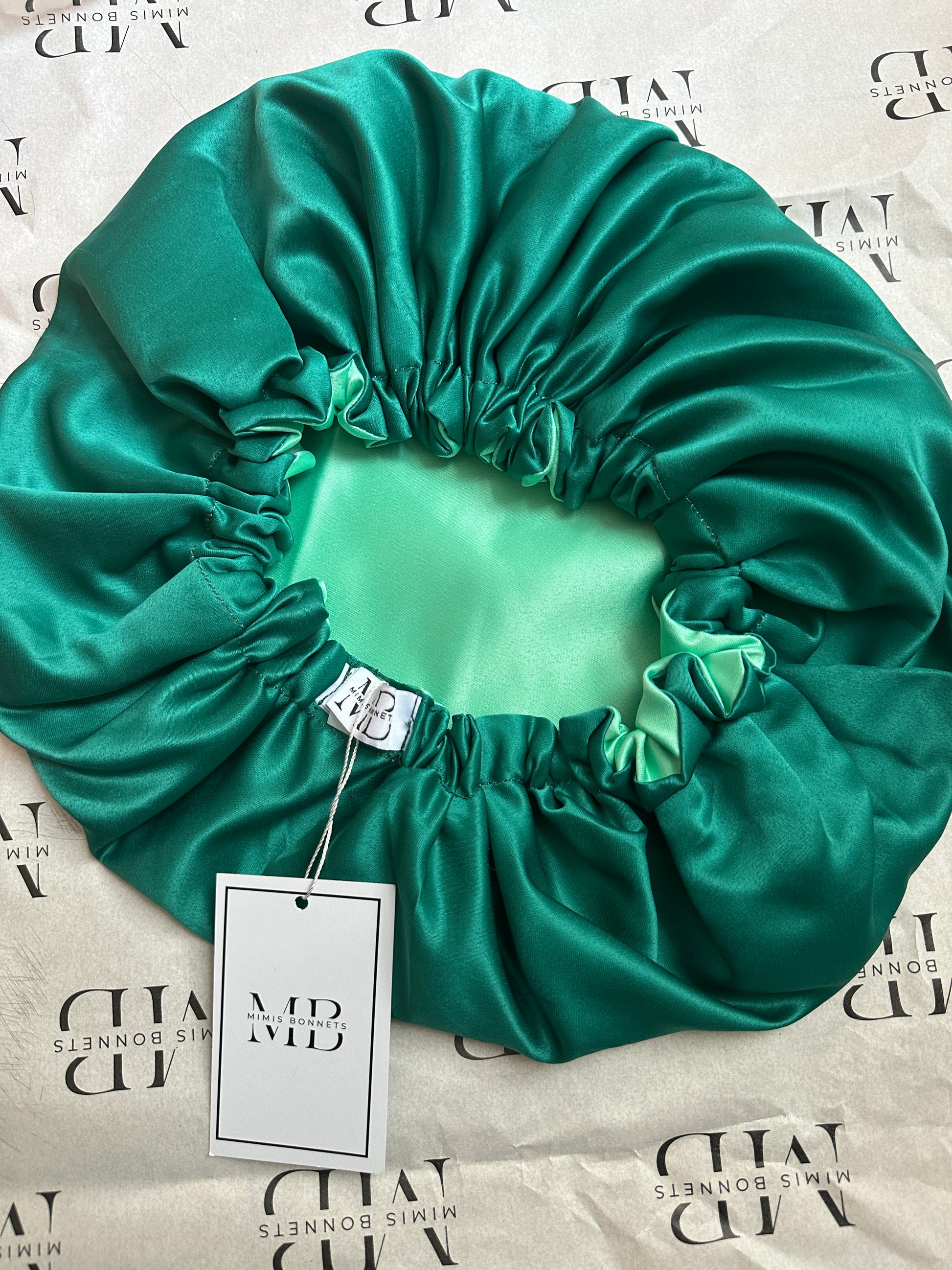 Mint Glow & Emerald Luxe satin reversible bonnets — now available