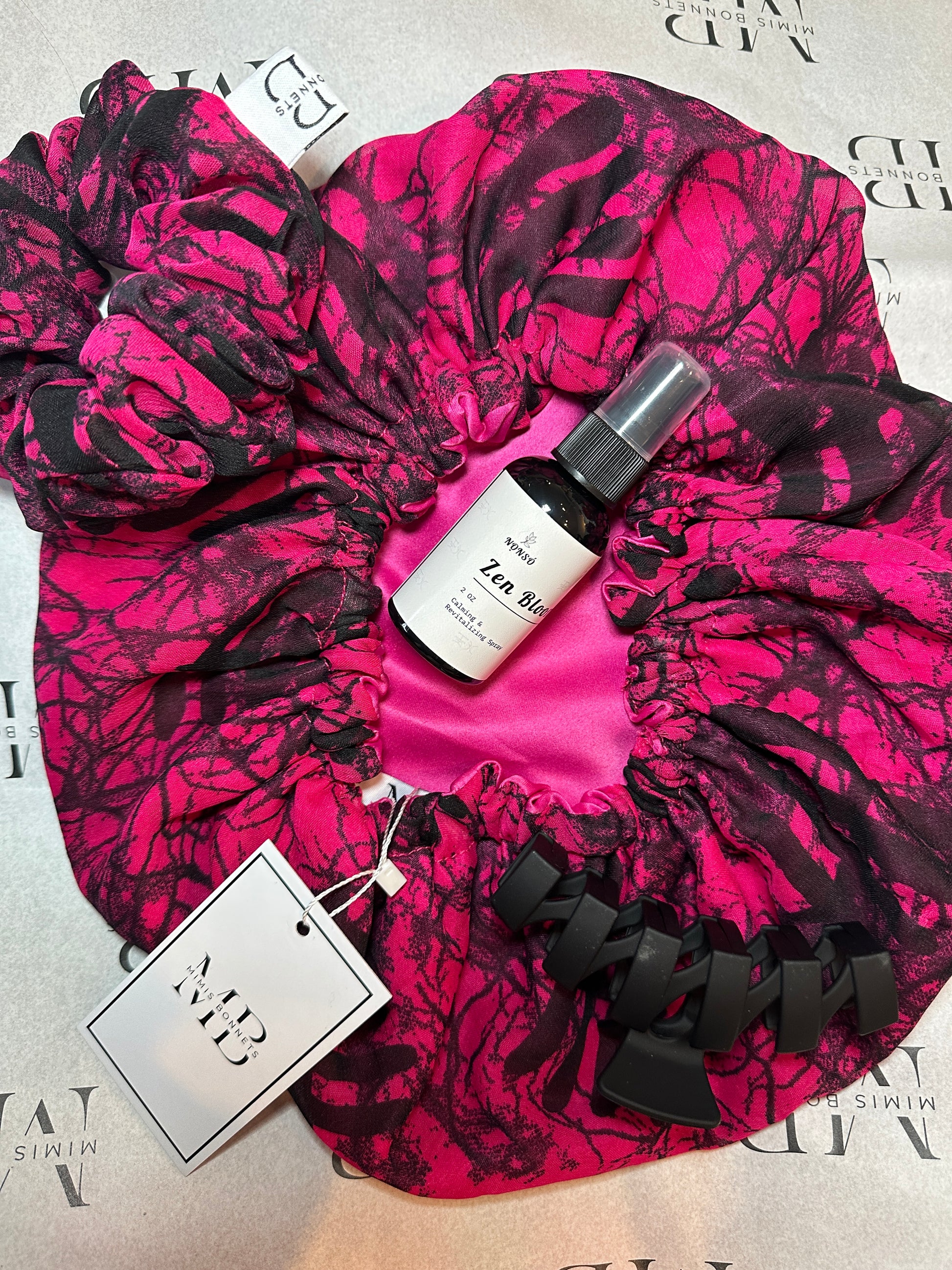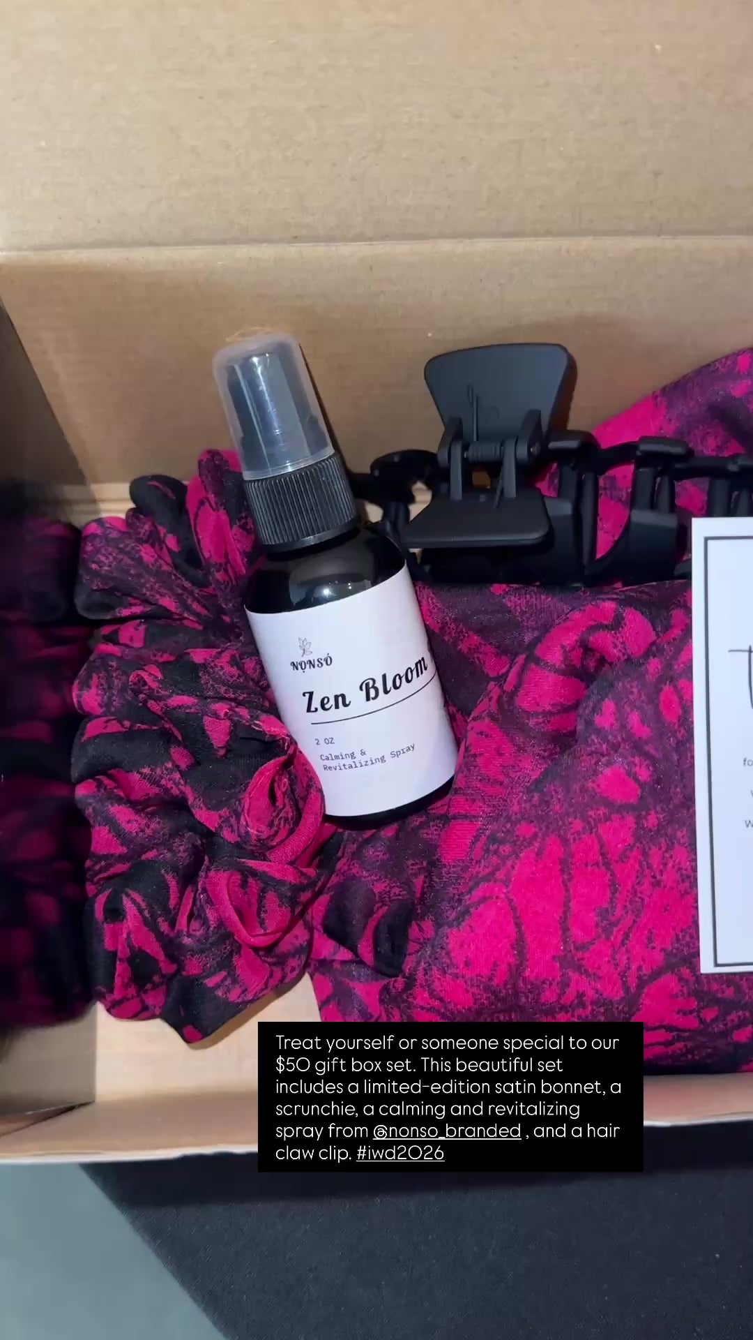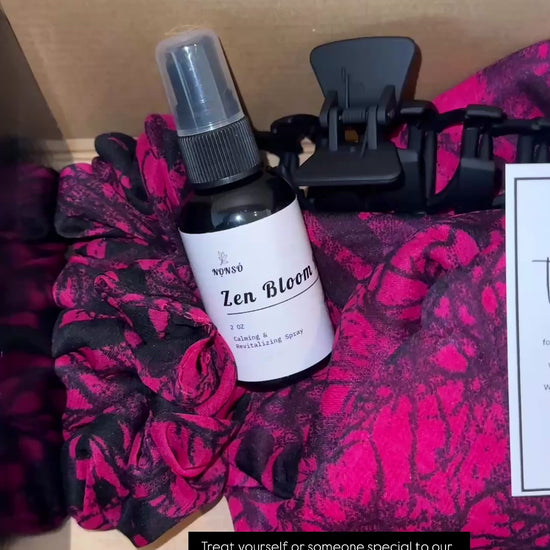 Our $50 gift box set is now available. It includes our limited-edition satin bonnet, a matching scrunchie, a calming and revitalizing spray from @nonsobranded, and a hair claw clip.